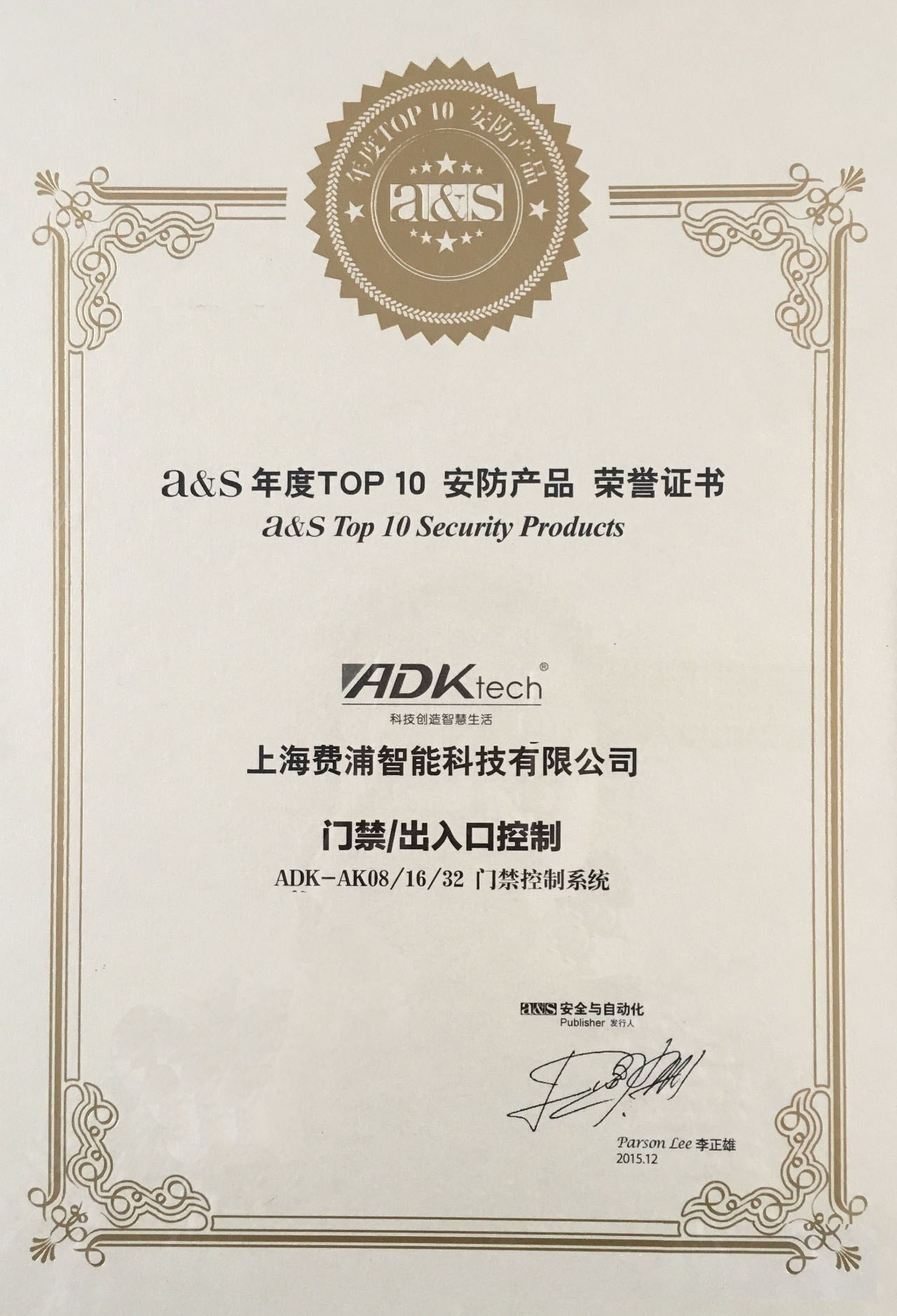 費浦智能榮獲A&S2015年度TOP10門禁/出入口控制產品